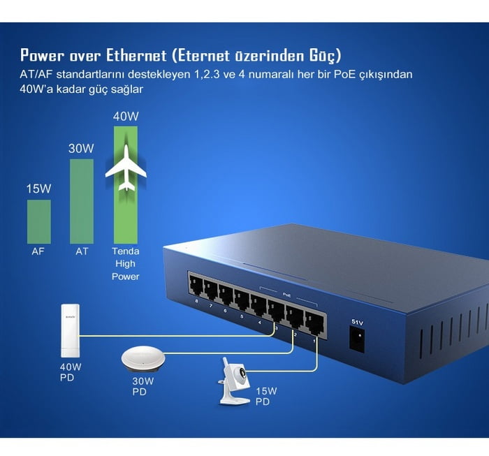 ► Port başına 40W’a kadar PoE güç sağlar