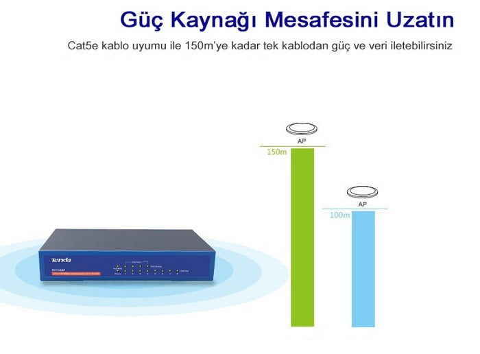 ► Cat5e kablo uyumu ile 150m’ye kadar tek kablodan hem veri hem güç transferi